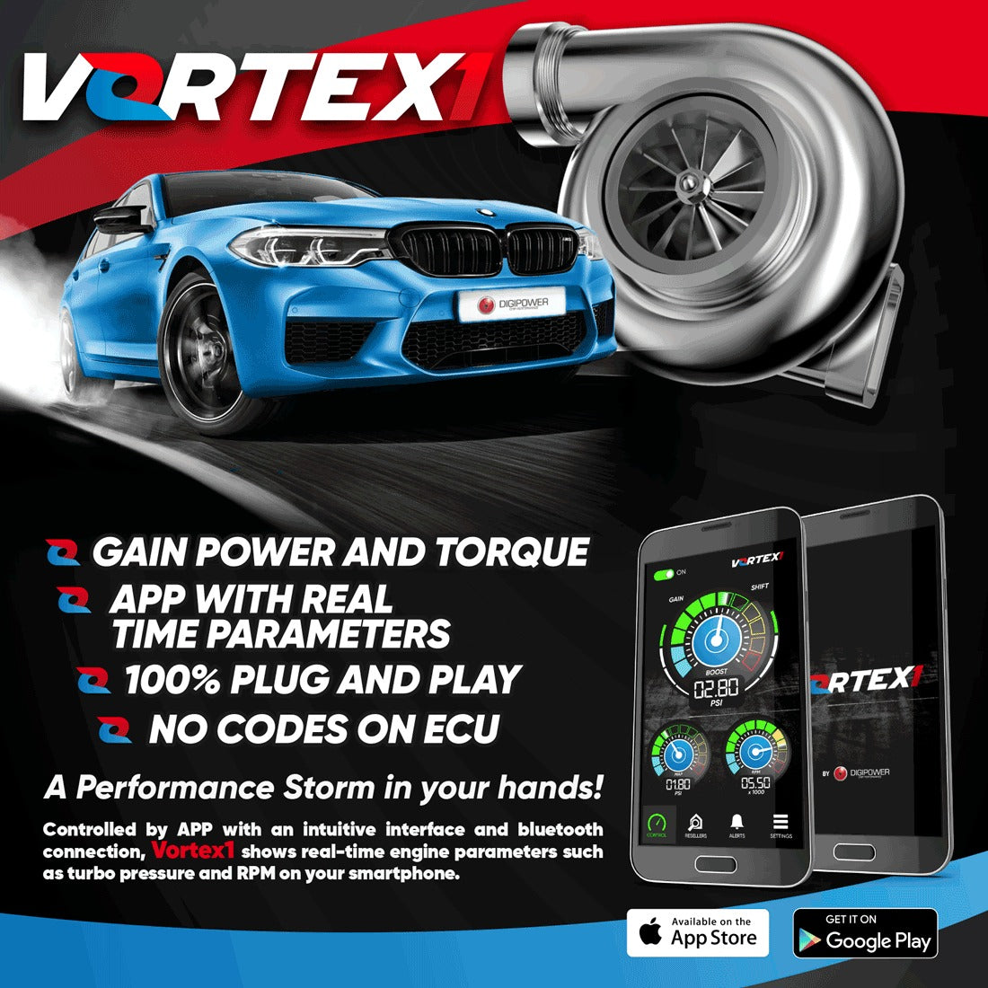 The Vortex1 is controlled by an app with an intuitive interface and Bluetooth connection. Vortex1 shows real-time engine parameters such as turbo pressure and RPM on your smartphone. Developed to the highest standards of quality and technology, Vortex1 is an external power module exclusively developed for stock turbo/gas cars. Increases torque and power by approximately 20-30%, always operating within the safety limits of the engine and without compromising the vehicle's warranty. Quick and safe installation with a 100% Plug & Play, allowing to keep all stock features when uninstalled, will not leave residual codes, and can be reinstalled countless times in vehicles with the same engine set.
